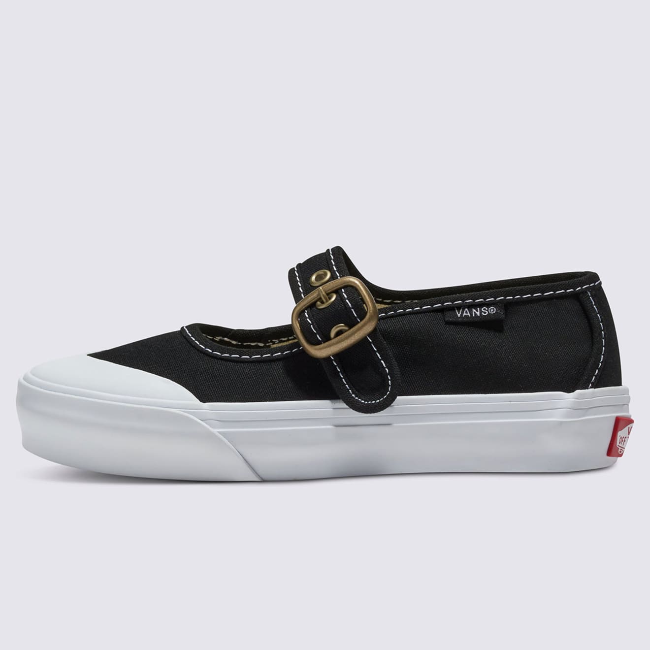 심플한 버클과 스트랩을 고무 토캡, 고대비 스티칭, 반스 시그니처 고무 와플 아웃솔과 결합했습니다.