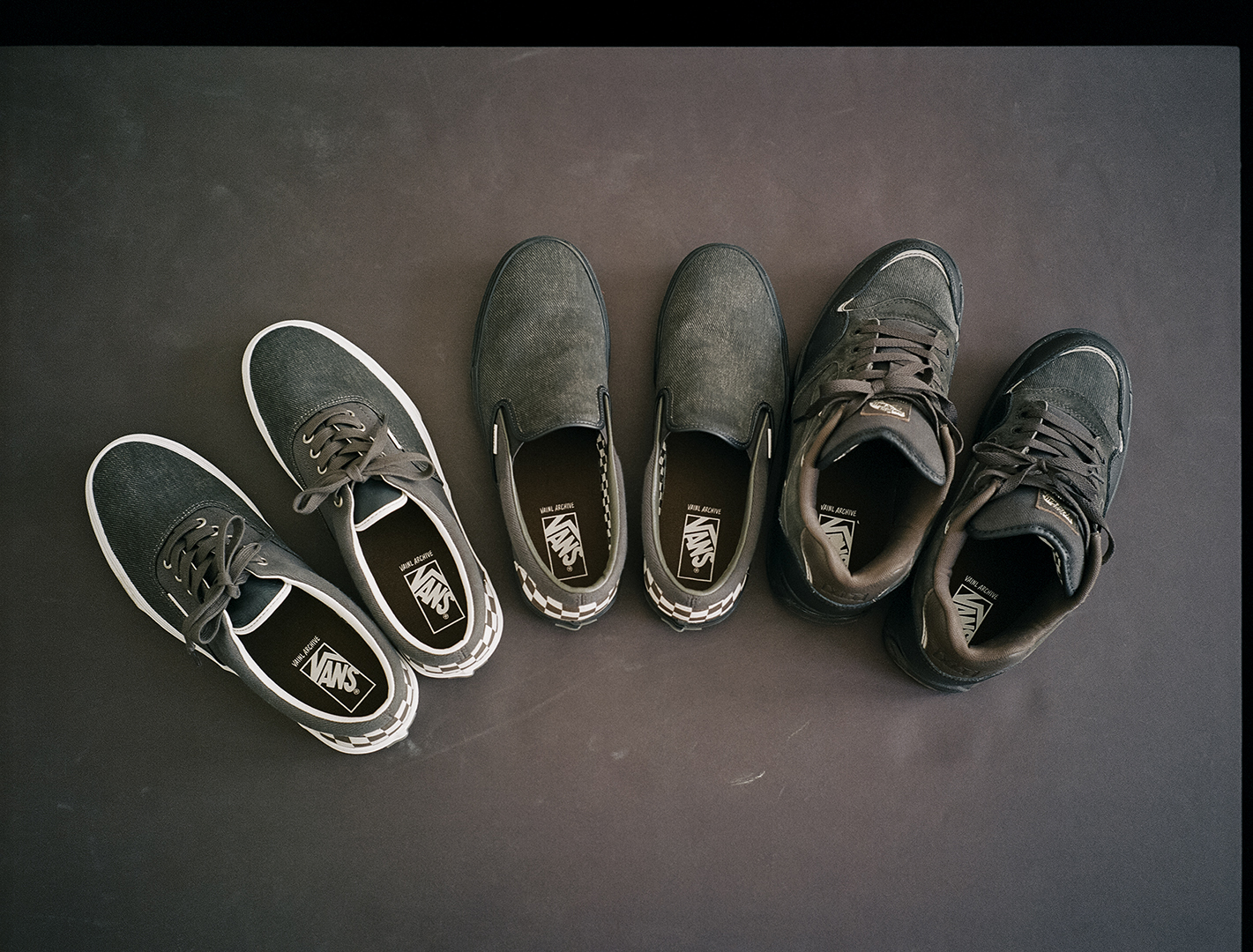 이번 컬렉션에는 바이닐 아카이브 메인 어패럴 라인의 시그니처 컬러인 브라운과 섀도우 블랙 컬러웨이가 적용되었다. 워싱 처리된 데님 어퍼와 힐 패치 및 안감의 체커보드가 특징인 클래식 슬립-온, 에라 및 로울리 XLT를 선보인다. 모든 실루엣에는 독특한 빈티지 감성을 표현하는 코딩 어퍼가 적용되었으며, 로울리 XLT는 오일드 스킨, 누벅, 캔버스로 구성된 혼합 소재의 어퍼를 통해 개성 있고 활용도 높은 스타일을 연출한다.