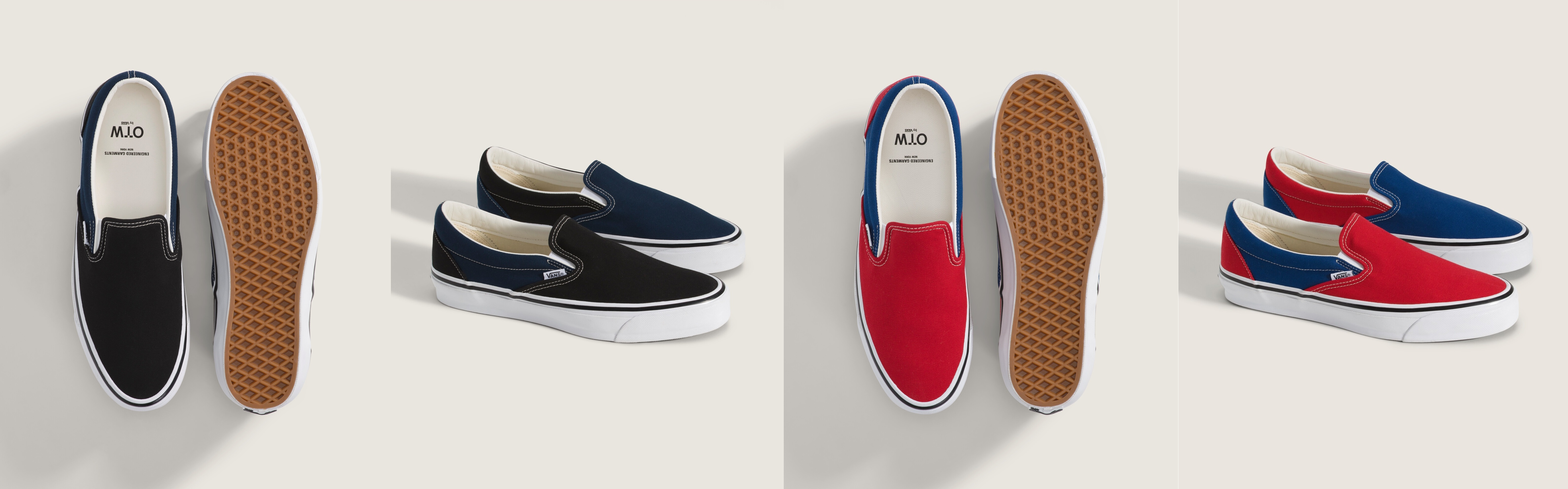 이번에 선보이는 OTW 바이 반스 x Engineered Garments 슬립-온은 ‘레드 & 네이비’와 ‘블랙 & 블루’ 두 가지 컬러웨이로 구성되며, 각각 좌우가 서로 다른 색상으로 디자인되었다.