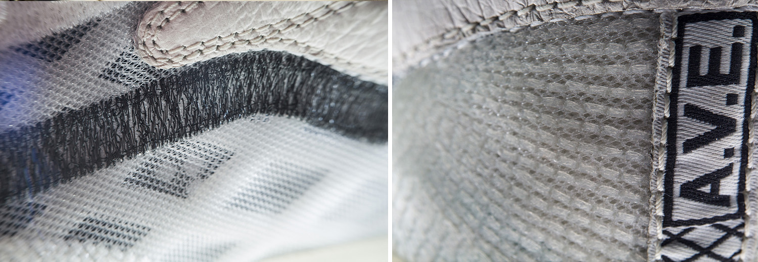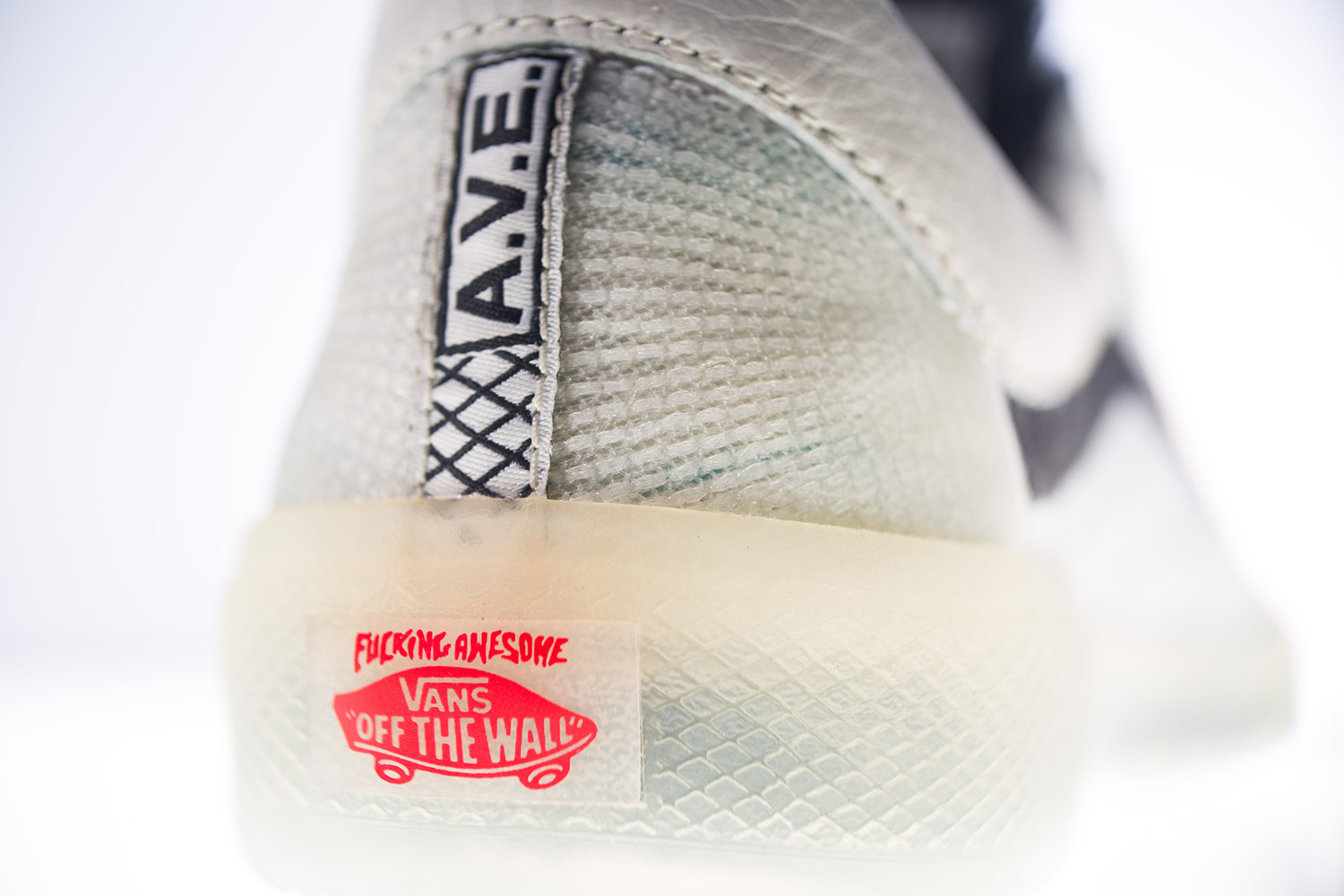 전체적으로 화이트와 블랙 컬러가 사용되었고, 빛을 반사하는 소재로 구성된 사이드스트라이프(SideStripe), 앤서니의 이니셜인 AVE를 새긴 힐 카운터, 그리고 반투명 아웃솔이 눈길을 끈다. 여기에 퍼킹 어썸이 직접 커스텀한 힐 캡 로고와 라벨 그리고 풋베드와 패키지에 적용된 ‘허트 유얼 아이즈(Hurt Your Eyes)’ 프린트로 컬렉션의 의미를 더했다.