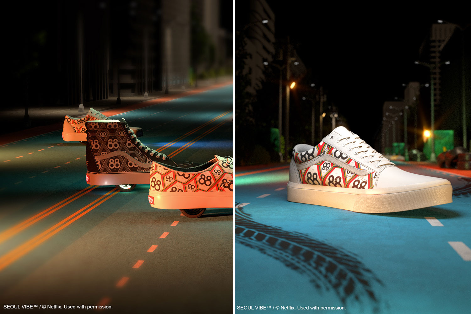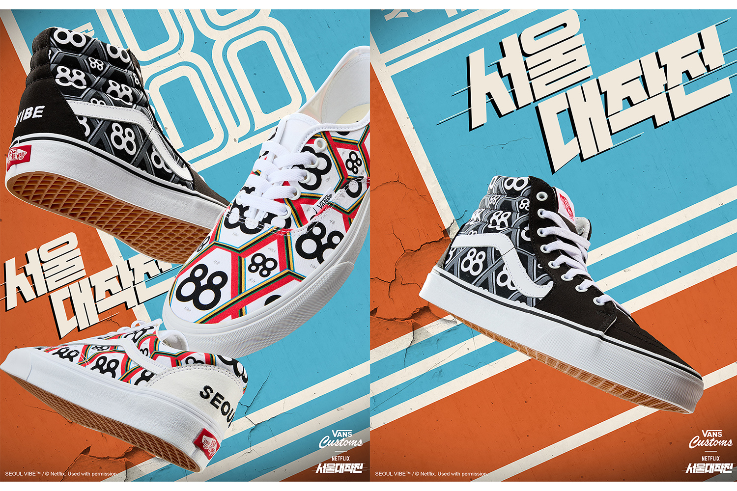 넷플릭스의 영화 <서울대작전>은 1988년 서울을 배경으로 한 카체이싱 액션 질주극이다. 유아인, 고경표, 옹성우 등이 주연으로 출연하며 상계동 슈프림팀이 거부할 수 없는 제안을 받고VIP 비자금 수사 작전에 투입되면서 벌어지는 내용을 담고 있는 블록버스터 범죄, 코미디 영화이다. 이번 커스텀 캠페인을 위해 반스는 <서울 대작전>에서 영감을 받은 세 가지 커스텀 슈즈 디자인을 선보인다. 88년 당대 일어났던 영화 속 사건들을 토대로 실루엣별 각각 블랙 모노톤과 컬러풀한 컬러웨이의 감각적인 아트워크 패턴을 더했다.