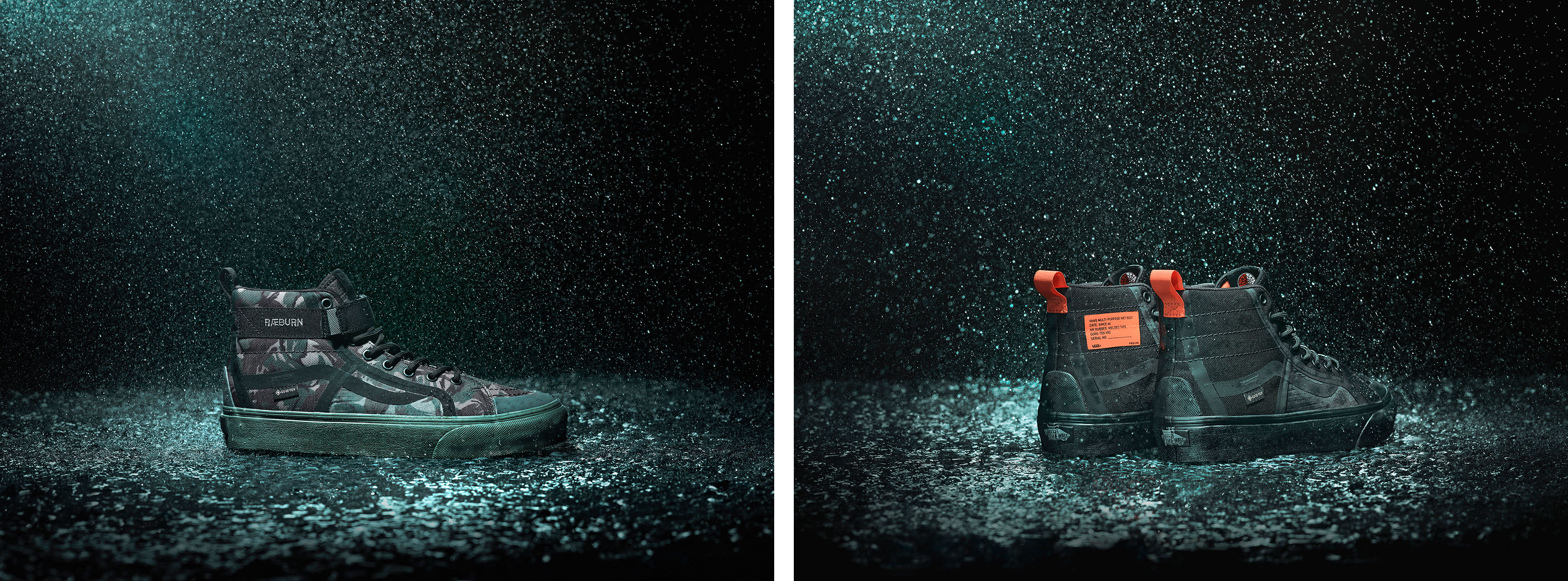 풋웨어는 혁신적인 소재로 한층 강화된 클래식 스케이트-하이 GTX VR3(SK8-Hi GTX VR3) 두종으로 구성되었다. 카모플라주 프린트와 발목 버클이 특징인 스케이트-하이 GTX VR3는 업그레이드된 기능과 함께 깔끔한 디자인이 눈에 띈다. 고무 토 캡과 방수 고어-텍스®( GORE-TEX®) 코팅이 어떤 환경에서도 발을 쾌적하게 유지해주며, 부분적으로 식물 기반 공급원에서 유래한 바이오 EVA 폼을 25% 이상 사용한 VR3쿠시™(VR3Cush™) 풋베드가 한 차원 높은 편안함을 제공한다. 한편 스케이트-하이 실루엣은 1966년 창립 이후 반스에 유명세를 안겨준 접지력과 내구성을 그대로 유지하는 동시에 천연 고무를 25% 이상 함유한 반스의 독점 합성재로 제작된 VR3와플 아웃솔로 업그레이드되었으며, 반스의 클래식한 스타일에 래번의 독특한 감성을 더했다. 보다 심플한 스타일을 원하는 이들을 위해 스케이트-하이 GTX VR3는 선명한 오렌지 컬러의 로고 라벨과 뒤꿈치 고리가 대조를 이루는 세련된 올블랙 컬러로 출시된다.